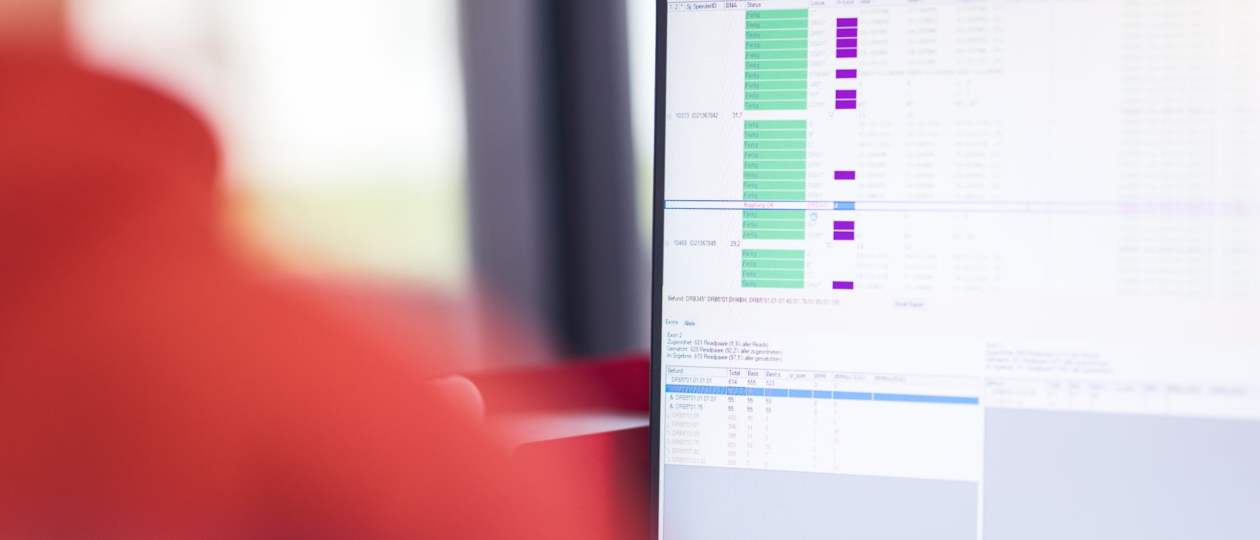 The genotyping Software team deploys the internal NGS analysis software neXtype. This involves being actively engaged in its development, quality monitoring, and troubleshooting. Along with the Bioinformatics team in Tuebingen, the Software team works on algorithm improvements and sequence database updates in line with current research developments. Validation and quality control of results and adherence to regulatory body requirements ensure high quality and timely transmission of genotyping results.