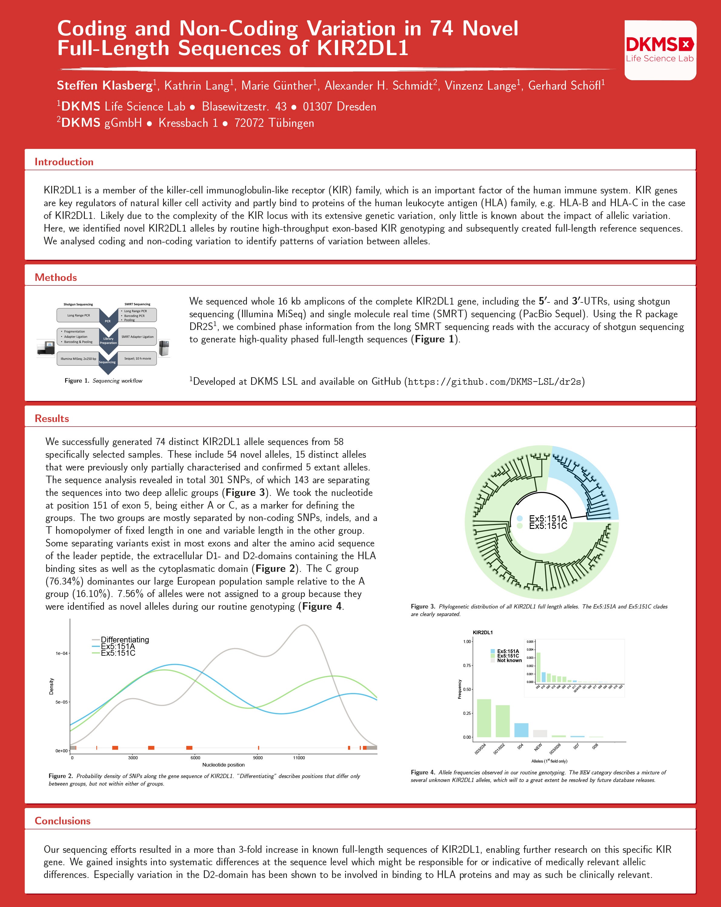 KIR2DL1 is a member of the killer-cell immunoglobulin-like receptor (KIR) family, which is an important factor of the human immune system. KIR genes are key regulators of natural killer cell activity and partly bind to proteins of the human leukocyte antigen (HLA) family, e.g. HLA-B and HLA-C in the case of KIR2DL1. Likely due to the complexity of the KIR locus with its extensive genetic variation, only little is known about the impact of allelic variation. Here, we identified novel KIR2DL1 alleles by routine high-throughput exon-based KIR genotyping and subsequently created full-length reference sequences. We analysed coding and non-coding variation to identify patterns of variation between alleles.