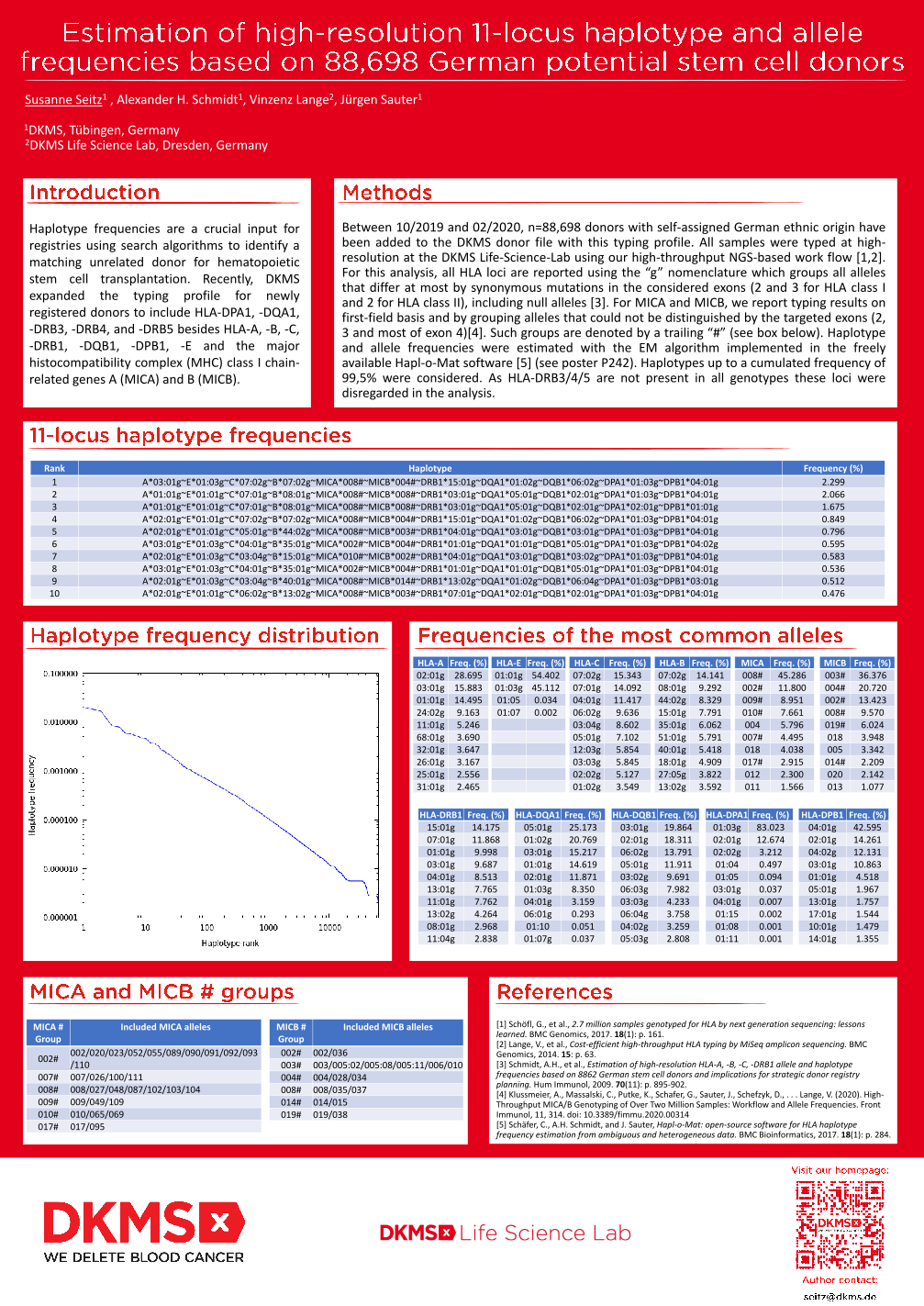 Haplotype frequencies are a crucial input for registries using search algorithms to identify a matching unrelated donor for hematopoietic stem cell transplantation. Recently, DKMS expanded the typing profile for newly registered donors to include HLA-DPA1, -DQA1, -DRB3, -DRB4, and -DRB5 besides HLA-A, -B, -C, -DRB1, -DQB1, -DPB1, -E and the major histocompatibility complex (MHC) class I chain-related genes A (MICA) and B (MICB).